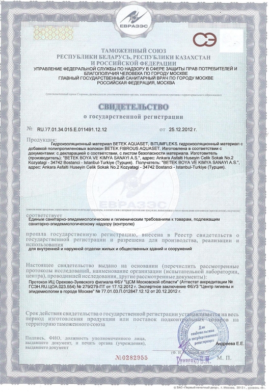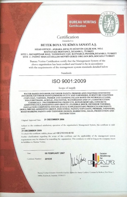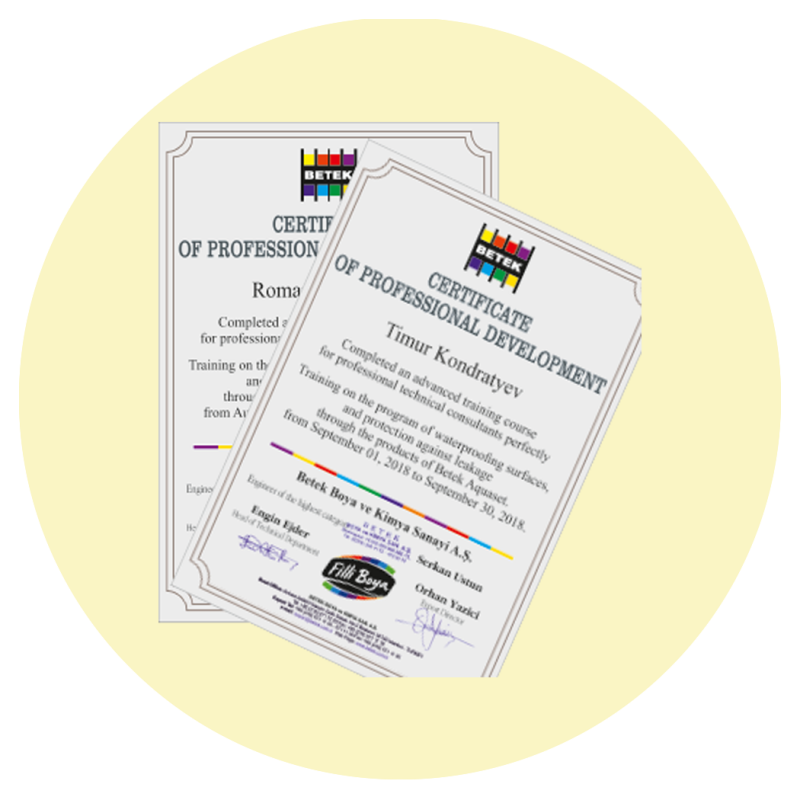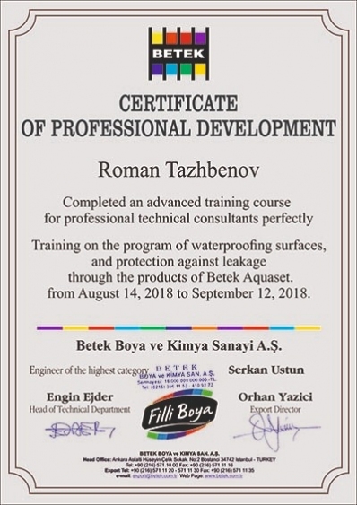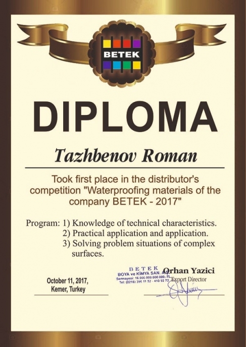 Сертифицирован Техническим отделом завода BETEK 2017г. г. Стамбул.