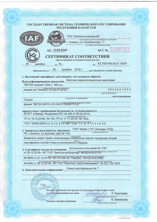 Сертифицирован Техническим отделом завода BETEK 2020г. г. Алматы.